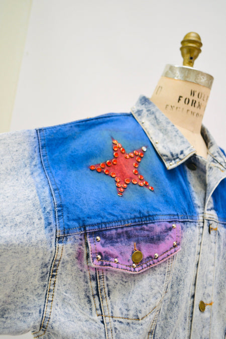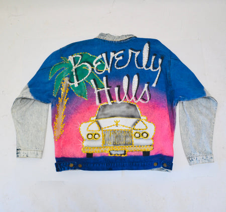 Quick Shop 80s 90s Vintage Denim Jacket Beverly Hills California Painted Rhinestones Airbrushed JEAN Jacket Large XL Tony Alamo Inspired Acid Wash $370.00 Quick Shop