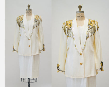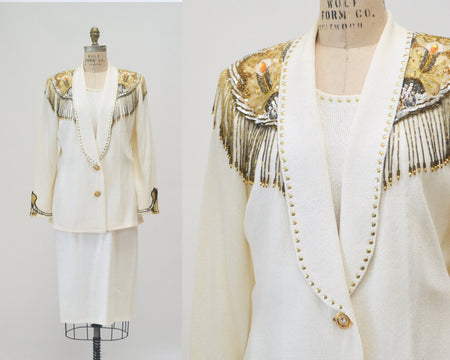 Quick Shop 80s 90s Vintage Cream Off White Knit Suit Fringe Sequin Beaded Gold Blazer Suit Jacket Skirt Medium Large By Francine Knit Wedding Suit $270.00 Quick Shop