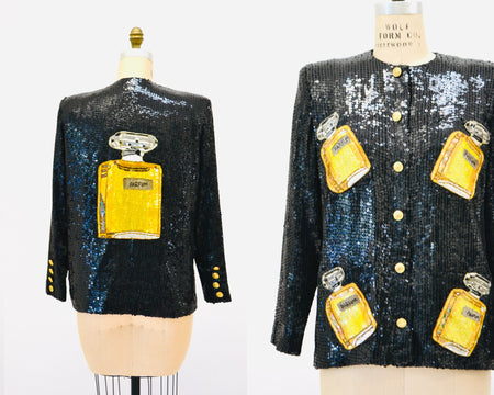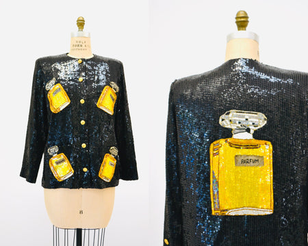 Quick Shop 80s 90s Vintage Black Sequin Jacket with Perfume Bottles By Jeanette for St martin Size Medium 80s 90s Pop Art Perfume Sequin bottles $880.00 Quick Shop