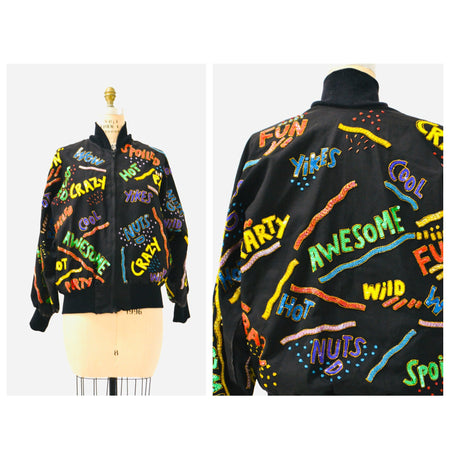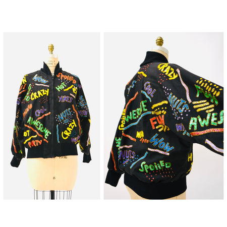 Quick Shop 80s 90s Vintage Black Sequin Jacket with Words 90s pop art// Vintage Black Sequin Jacket Bomber Awesome Party Fun Jacket Medium Large XL $270.00 Quick Shop