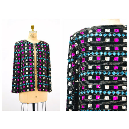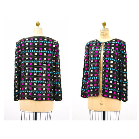 Quick Shop 80s 90s Vintage Black Sequin Jacket Size Large Metallic Blue Silver Pink Sequin Beaded Jacket Black Geometric Glam Jacket Party Jacket Large $140.00 Quick Shop