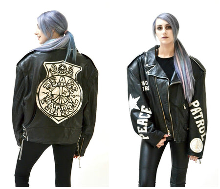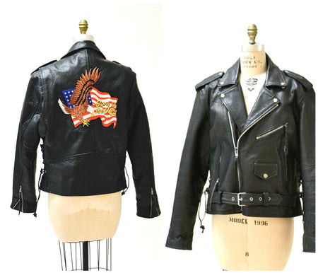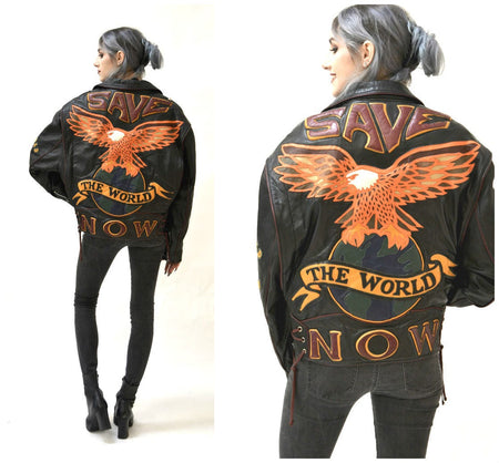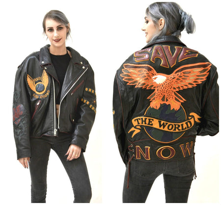 Quick Shop Vintage Black Leather Motorcycle Jacket Eagle Bird Large XL// Vintage Black Leather Biker Jacket Jeff Hamilton Save The World Eagle $1,355.00 Quick Shop