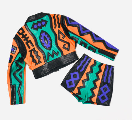 Quick Shop Vintage Black Leather Motorcycle Jacket Michael Hoban North Beach Tribal// Vintage Leather Biker Jacket Black Green Orange Medium Large $925.00 Quick Shop