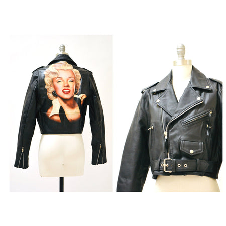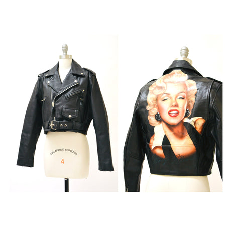 Quick Shop Vintage Black Leather Motorcycle Jacket Marilynn Monroe Small Medium// Vintage Black Leather Biker Jacket Airbrush Painted Jacket FMC $780.00 Quick Shop