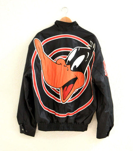 Quick Shop Vintage Black Leather Jacket with Comic Daffy Duck Leather Jacket Black Large XL// Vintage Looney Tunes Pop Art Leather Jacket Warner Bros $455.00 Quick Shop
