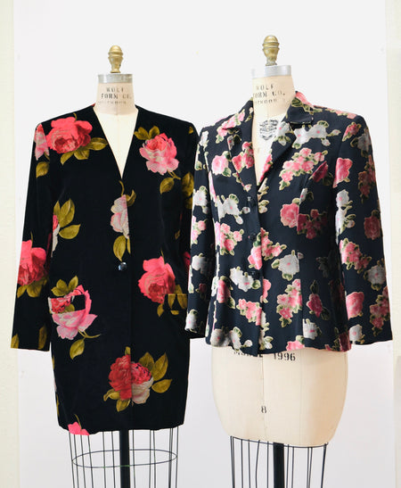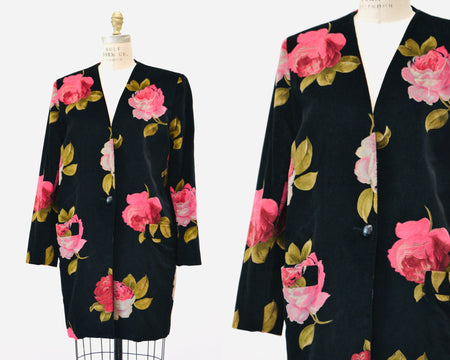 Quick Shop Vintage Floral Print Jacket Blazer Size Medium Large Black Pink Rose Flower Printed Jacket Blazer in Cotton Velour Lightweight Jacket $100.00 Quick Shop