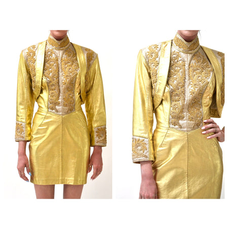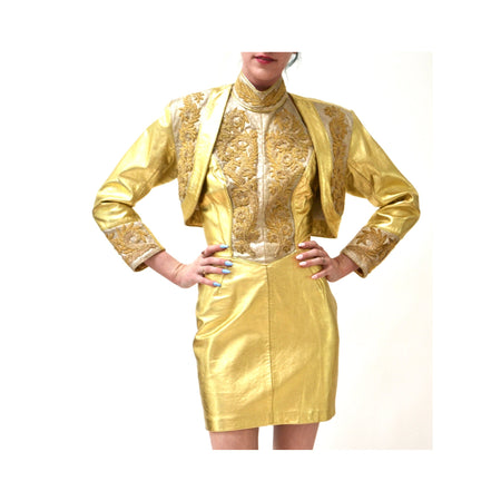 Quick Shop Vintage Gold Metallic Leather Jacket Bolero with Embroidery Michael Hoban North beach Leather Small 90s Glam Gold Leather Jacket Cropped $482.95 Quick Shop