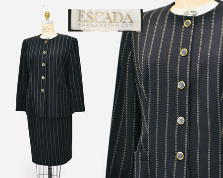 Quick Shop Vintage Escada Suit Pinstripe Wool Escada Suit Jacket Skirt Blazer Large Black white Striped Skirt Suit Black Stripe Jacket Medium Large $160.00 Quick Shop