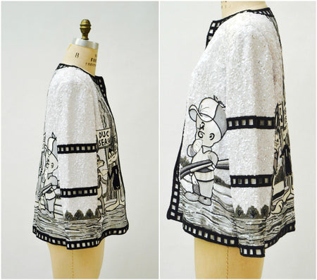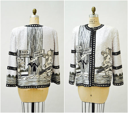 Quick Shop Vintage Jeanette Kastenberg Platinum Sequin Jacket Black White Comic Bugs Bunny Looney Tunes Cartoon Hunting Beaded Jacket Large XL $2,280.00 Quick Shop