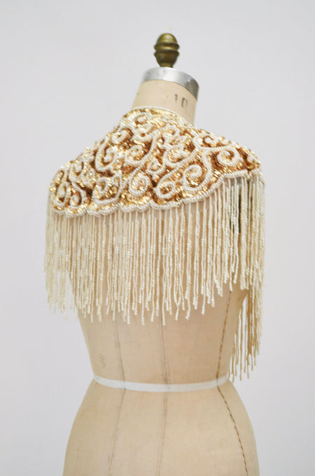 Quick Shop Vintage Gold Pearl White Cream Beaded Sequin Shawl Wrap Burlesque Wedding Flapper Gold Metallic Beaded Wedding Vintage Fringe Collar Shawl $234.00 Quick Shop