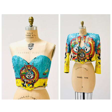 Quick Shop Vintage Jeanette Kastenberg Platinum Sequin Jacket Looney Tunes Bugs Bunny Warner Brothers Cartoon Comic Beaded Jacket Small $4,530.00 Quick Shop