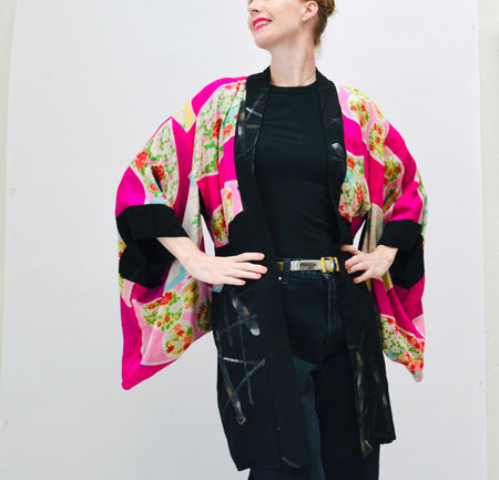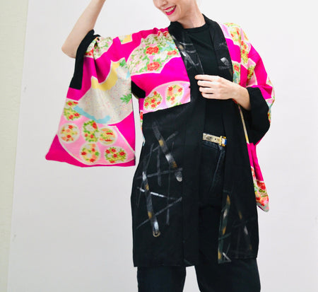 Quick Shop Vintage Kimono Jacket Robe Pink Black Fan Floral Print Robe Reversible // Vintage Kimono Robe Pink Japan Japanese Traditional Kimono Costume $180.00 Quick Shop