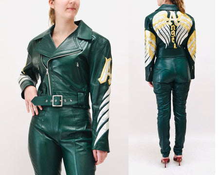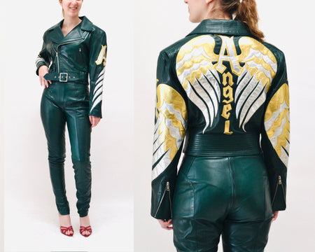 Quick Shop Vintage Leather Motorcycle Jacket and Pants by North Beach Michael Hoban// Vintage Green Gold Metallic Leather Moto Angel Wings Leather Suit $1,240.00 Quick Shop