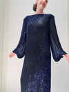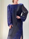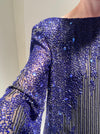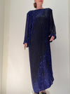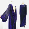 Home/Collections/Dresses/80s 90s Vintage Beaded Sequin Gown Dress Medium Large By Bob Mackie Blue Black Rhinestones Long Sleeve Blue Beaded Conservative Draped Gown