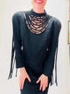 Home/Collections/Dresses/80s Louis Feraud Vintage Black Fringe Dress Black Designer Cocktail Long Sleeve Dress Medium Large// 90s Black Party Little Black Dress