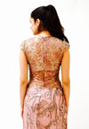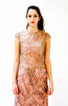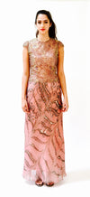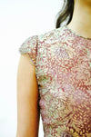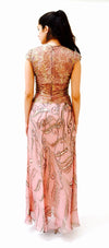 Gorgeous pink metallic lace and silk dress features: * Bodice is constructed in stunning metallic pink/mauve lace with gold iridescent accents. * Gorgeous scalloped edge cap sleeves * Fit bodice * Bias cut skirt constructed in 2 semi sheer layers of silk organza * Skirt layers include top pink layer with abstract printed butterfly pattern and 2nd layer is ivory * separate pink skirt lining is included for additional coverage * back zipper closure * Fully lined * Absolutely stunning No Brand, custom made for black tie affair No size, fits like a small (shown on a size 2/4 model, 5'8) 100% silk organza with lace **MEASUREMENTS** Bust 1” below armhole 34” Waist 28" Hip 44" Length from top of dress 62" All measurements are given in full. Visit the shop https://www.etsy.com/shop/Hookedonhoney ** twitter | hookedonhoney ** pinterest | hookedonhoney Thank you for visiting Hooked On Honey, and remember you can never look too fabulous!!