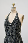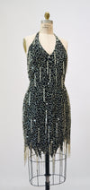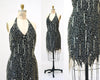 Home/Collections/Dresses/90s Vintage Black Silver Beaded Fringe Showgirl Dress Medium // 90s Black Silver Beaded Halter Dress Party Fringe Flapper Dress Nite line