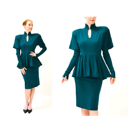Quick Shop 80s does 40s Vintage Teal Blue Green Knit Wool Dress Small Medium Wool Jersey Knit Dress Green teal Long Sleeve Peplum Dress Bonnie Strauss $160.00 Quick Shop