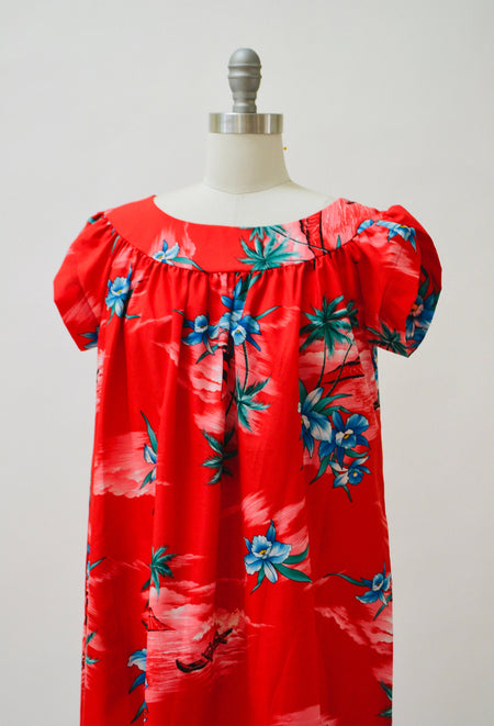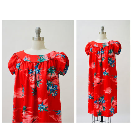 Quick Shop 80s Vintage Red Hawaiian floral Print Dress Size Large Beach Cover Up Moo Moo Red Tropical Print Dress Palm Tree Hawaiian Print dress $84.00 Quick Shop
