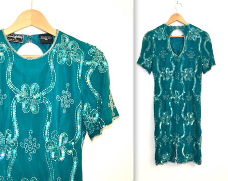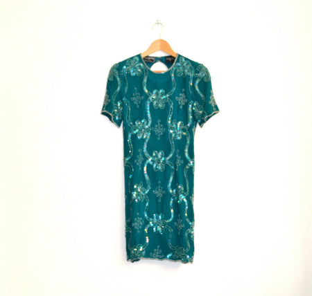 Quick Shop 90s Vintage Sequin Dress Flapper Inspired Sequin Dress size XS Small in Teal Blue// Vintage Beaded Dress in Blue Green $102.95 Quick Shop