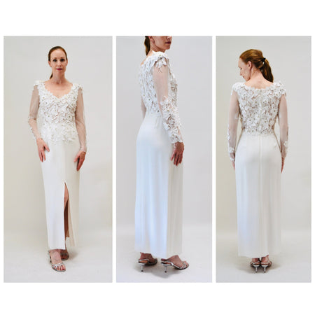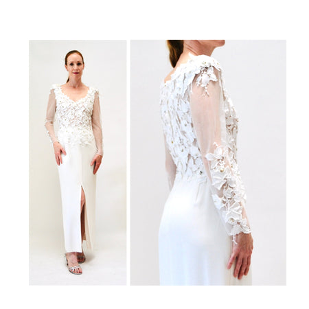 Quick Shop 90s Vintage White Sheer Mesh Lace Rhinestone Gown Dress Long sleeves Yoly Muñoz Medium // Vintage Mesh Lace Wedding Dress Beaded Flower Gown $660.00 Quick Shop