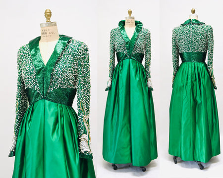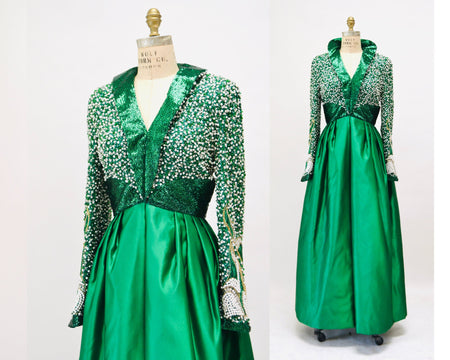 Quick Shop Vintage 90s Stephen Yearick Green Silk Beaded Sequin Ball Gown Dress Emerald Green Sequin Beaded Silk Long Sleeve Dress Gown Small Medium $795.00 Quick Shop