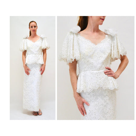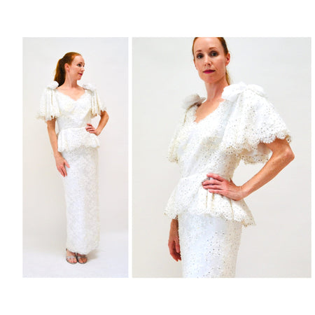 Quick Shop 90s Lace Rhinestone Pearl Vintage Evening Gown Wedding Dress Small Medium Ruffles Flowers // 80s White Metallic Lace Wedding Party Dress $710.00 Quick Shop