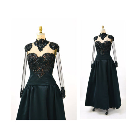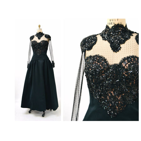 Quick Shop 80s 90s Black Sequin Ball Gown Jarin by Ruben Panis Small// Vintage 80s Black Sheer Mesh Sequin Dress Pageant Princess Gown By Jarin Couture $310.00 Quick Shop