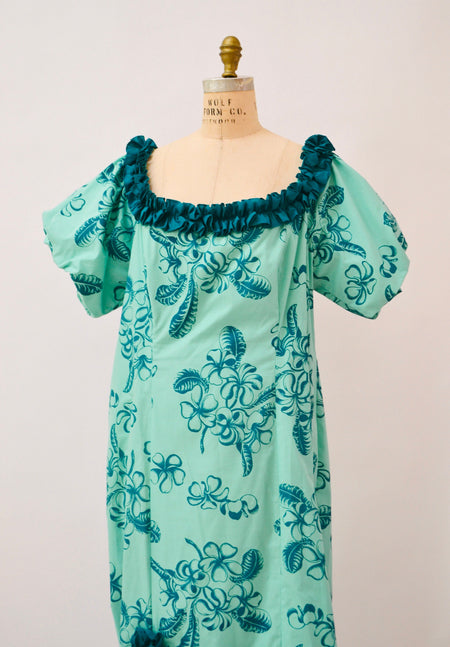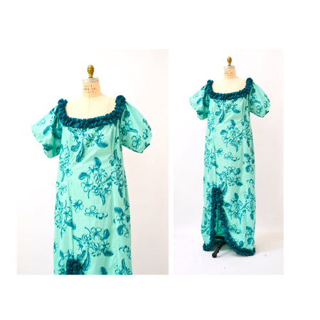 Quick Shop Vintage Hawaiian Floral Print Long Dress Large XL Beach Dress Hawaiian Princess Kaiulani Blue Green Tropical Ruffle Dress Made in Hawaii $160.00 Quick Shop
