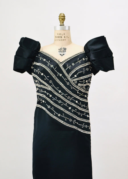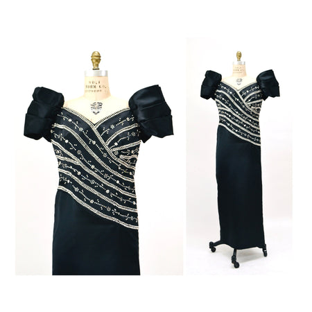 Quick Shop 80s 90s Vintage Black Evening Gown Rhinestones Poof Sleeves Medium Large by Rose Taft// Vintage Black Metallic Pageant Dynasty Dress Gown $270.00 Quick Shop