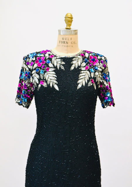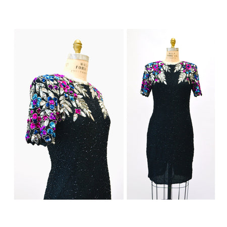 Quick Shop 80s 90s Vintage Black Sequin Beaded Dress Small Flower Beaded Dress 90s Glam Flapper Black Metallic Beaded Flower Dress Short Sleeve Small $140.00 Quick Shop