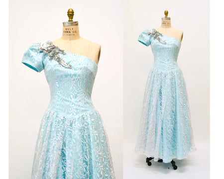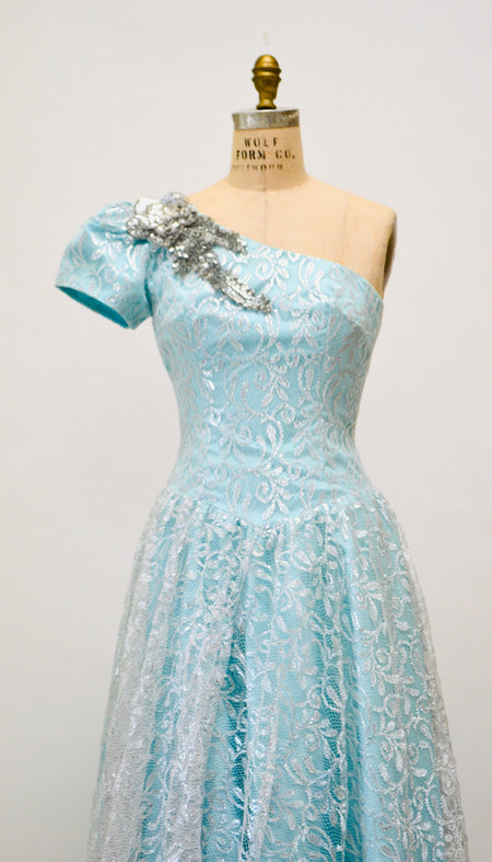 Quick Shop Metallic 80s Prom Dress XS Small Silver and Blue// Blue Vintage Metallic lace Ball Gown One Shoulder Princess Dress XS Small Alyce Design $190.00 Quick Shop