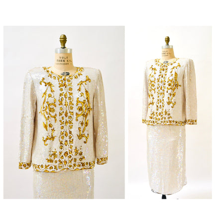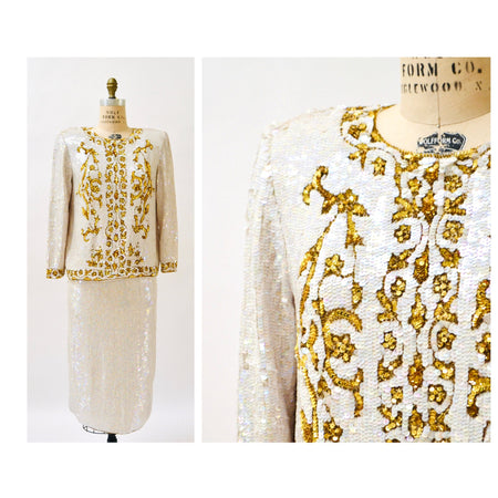 Quick Shop 80s 90s Vintage White Metallic Sequin Top Skirt Dress Metallic White Gold Sequin Wedding Mother Of the Bride Modest Wedding Dress Large $170.00 Quick Shop