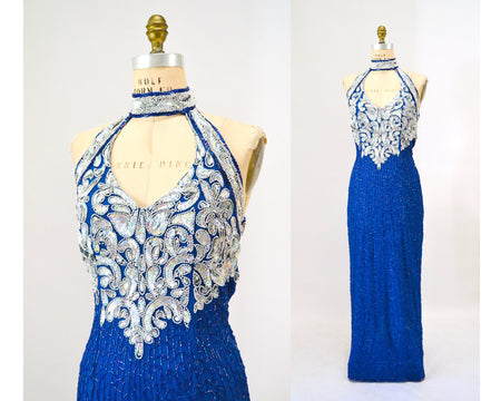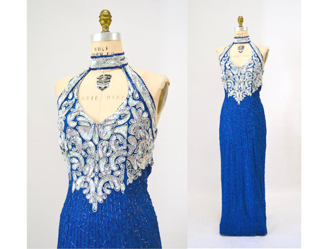 Quick Shop 90s Vintage Blue Silver Beaded Gown Sequin Dress Medium Large Blue Halter Neck Silk Pageant Gown // Vintage Blue Pageant Barbie Gown $210.00 Quick Shop