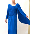 Home/Products/Vintage Draped Goddess Dress Gown Large XL Cobalt Blue By Rose Taft// Vintage Blue Evening Gown Dress Asymmetrical Long Sleeves Bright Blue