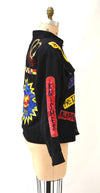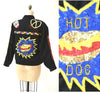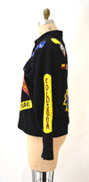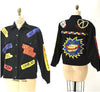 Home/Products/Vintage Sequin Jacket Black with Hot dog Carnival Junk Food Large// Vintage Black Sequin Jacket Carnival Coney Island Comic Pop Art By Modi